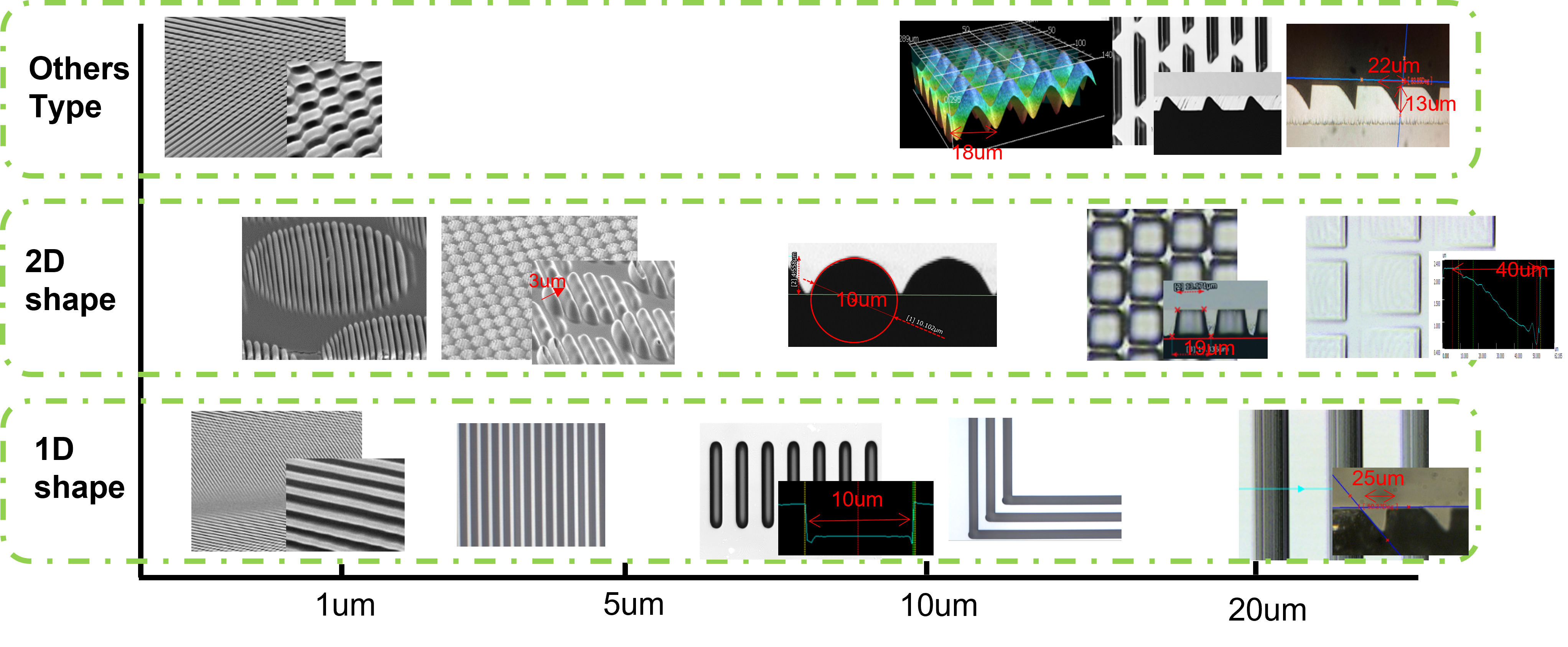 自有光刻奈米微結構技術,尺寸可從亞微米 (sub-micrometer)到微米 (micrometer)